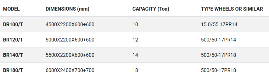 Sideboards extensions - Double axle with cantilever suspension - Smooth platform - Lateral sides with central columns from model BR120/T - Upside down opening only rear and - hinged and removable lateral sides - Hydraulic or pneumatic braking on No. 1 or No. 2 axles + parking brake - Electric light system.