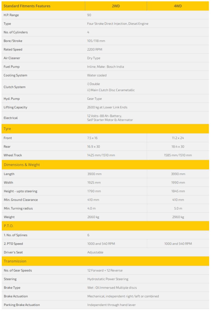 Synchromesh Gear Box with 12 + 12 Speeds, Power Steering, Heavy 2600 Kgs Lift, Oil Immersed Brakes, Epicyclic Reduction, Multi Speed PTO, Dual Clutch, Dry Air Cleaner, Dual DC Valve, Front Weight