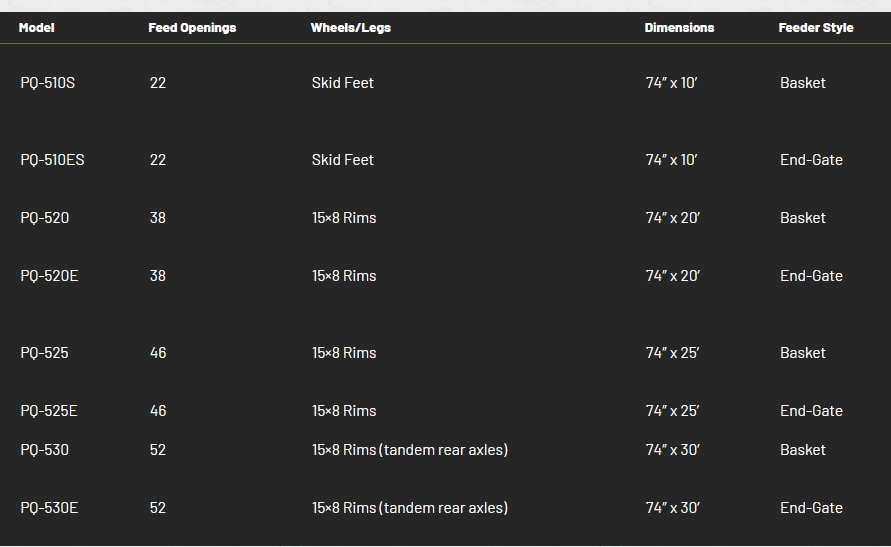 The PQ series comes in a variety of configurations to suit specific farming needs. The standard version of the PQ series cattle hay feeder contains a “basket” frame in the center to hold bales and silage (when inserts are added to the basket); these feeders are loaded over the top. The rear-entry version of the feeder adds a back gate for loading hay and bales rest on two low rails just above the trough; the rear-entry model is designated with an “E” in the model number.