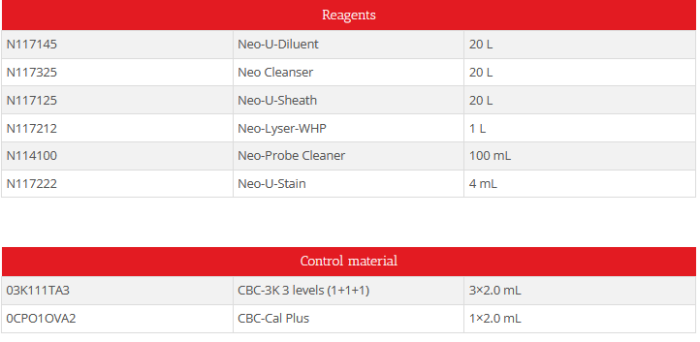 - Parameters WBC, LYM#, MON#, NEU#, EOS#, BAS#, LYM%, MON%, NEU%, EOS%, BAS% , RBC, HGB, HCT, MCV, MCH, MCHC, RDW-SD, RDW-CV, PLT, MPV, PDW, PCT, P-LCR, P-LCC