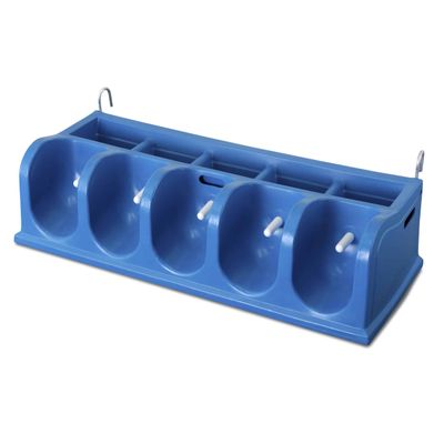 The troughs have compartments each holding 2 litres (3 1/2 pints) to the ridge along the back or 3 litres (5 1/4 pints) to the top of the weirs. You only need to fill up as many compartments as you have calves per pen. One sick calf can be given medicated milk/electrolytes if necessary and the rest plain milk. Colostrum can be fed to new born calves before they can stand; simply put the feeder on the floor and push to the calf`s mouth. It is ideal for introducing the first feed to bought in calves from market - without the struggle!