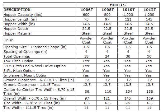 8-foot spreader with tow hitch. 12 cu. ft. hopper capacity with approximately 800 pounds of capacity (1.5 cu. ft. capacity per foot). Wheel tread 110 inches (with wheels dished in). Overall width, 123 inches. Includes hydraulic shut-off, weather-tight removable and reversible covers with spill guards and dual lock-down latches for each cover, adjustable spread plate, powder angles, shur-feed rotor bars and removable stub drive for rotor. Bottom openings spaced 4-inches apart for a total of 24 openings. Note: Tires and rims ordered separately. For hydraulic shutoff, user supplies all hydraulic hoses and NPT fitting.