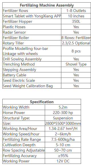 Through the intelligent precision fertilization electric drive control system, control tablet APP control, digital intelligent input, radar speed measurement synchronous control, detection automatic variable adjustment, pneumatic forced fertilization. Electronic sensors monitor empty boxes, leaks, blockages, and alarm devices.