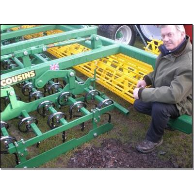 Cousins have combined a number of their cultivation attachments to produce an effective, single pass seedbed system. The two rows of straight leading tines offer individually depth adjustment for penetration within tractor wheelings. These are followed by a full width, hydraulic Springboard with springing elements.