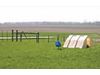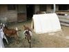 100% virgin UV stabilized food grade plastic. Medium density - long life. One piece molded. 90 lbs.. 86" L x 69" W x 48" H. Draft free housing - 6 goats. Kidding and isolation. A-Frame design. Non-condusive to play.
