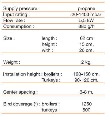The round emitter and the specially designed shape of the reflector creates 2-3°C more heat at birds level with a maximum brooding zone and maintains the highest fuel efficiency. An al stainless steel construction makes the `Mirage` virtually maintenance-free, it is easy to install and simple to maintain. All `Mirage` heaters can be hooked up to an automatic gas control.