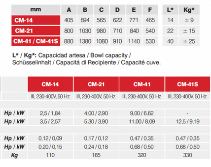 Motores - Motors - Moloren - Motore - Moteurs: Cuchillas / Blades / Messef / Colteli / Couteaux 1 -1500rpm. 2-3000rpm Artesa / Bowl / Schusscl / flecipiente / Cuve. 1 -10 rpm 2 - 20 rpm. Peso Neto - Net Weight - Netto Gewicht - Pesso Netto - Poids net.