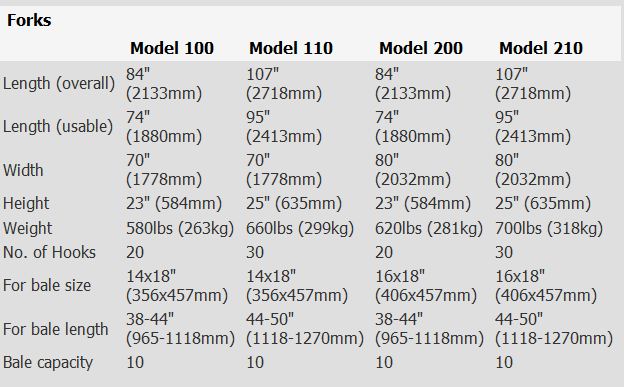 Accumulated bales are quickly picked up with one of these forks mounted to your loader. These models are also ideal for all-around loading and stacking. Bales can be loaded on your own hay trailers, trucks, or semi-trailers. The 100 series is for 14` x 18` bales, and the 200 series is for 16` x 18` bales. Each series has two lengths available to match your bale size. Bales may be picked up, moved, and stacked as high as your loader will raise, anywhere your tractor will go, and retrieved just as easily. When stacked, the bales will be tighter together and more weather resistant than if stacked by hand.