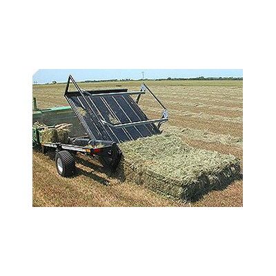 This unit attaches directly to the baler at two points; the baler`s wagon hitch and a stabilizer hitch. These two hitch points keep the accumulator aligned with the bale chamber at all times. This allows the baler/accumu-lator combination to be backed up as a unit. Towed behind the baler, the accumulator is powered by the tractor`s hydraulic system. As the baler pushes the bales onto the accumulator, a pivoting arm automatically lifts two bales at a time and puts them on the bed, while turning them a quarter turn. By turning the bales on edge, hay spoilage and mold is reduced, and the bales will keep their shape better. When fully loaded with ten bales the bed automatically dumps, and the bales slide off the back in a tight uniform package. There`s no need to stop or slow down, the unit does it all. The high dump angle assures that all the bales will slide off evenly, regardless of travel speed. These packages of bales are now ready to be picked up with a fork.