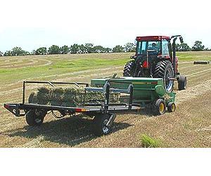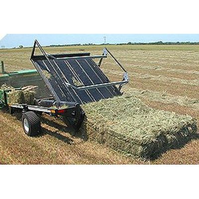 When fully loaded with ten bales the bed automatically dumps, and the bales slide off the back in a tight uniform package. There`s no need to stop or slow down, the unit does it all. The high dump angle assures that all the bales will slide off evenly, regardless of travel speed. These packages of bales are now ready to be picked up with a fork.