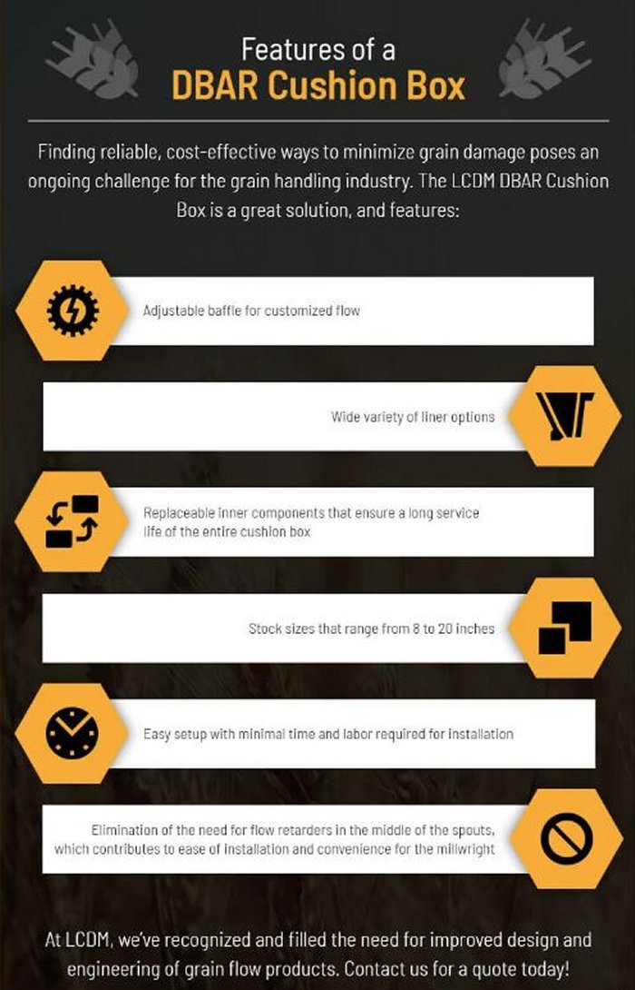 Finding reliable, cost-effective ways to minimize grain damage poses an ongoing challenge for the grain handling industry. LCDM offers the innovative DBAR Adjustable Cushion Box, which is revolutionizing the grain flow equipment industry. The DBAR features a patented design that reduces grain damage by more than 50 percent — and in some cases, eliminates it entirely. And less grain damage means a more productive and profitable operation.