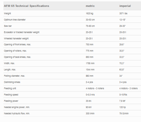 AFM 65 is a strong, reliable and highly productive harvester head for medium sized wood which can work on both wheeled and tracked machines. AFM 65 means an optimal combination between capacity, weight, feeding power and force and is an efficient tool for clearcuttings, big thinnings and processing operations. Four movable knives on AFM 65 allow smooth and accurate delimbing even of big trees with heavy branches. The stem is constantly centered in the head with four feeding rollers ensuring precise length and diameter measuring. Proportional adjustments of pressures on rollers and knives according to the stem diameter increase considerably the effectiveness of feeding and delimbing. The shape of knives on AFM 65 allows easy working from pile or in wind stormed areas. AFM 65 can work with a variety of different measuring systems and can be easily adapted to any type of base machine. The AFM 65 is perfectly suited for 20-25 tons excavators, wheeled and tracked harvesters.