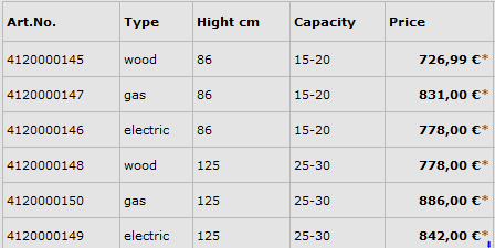 Available in sizes of 86 cm and 125 cm hight, as wood, gas and electric versions. Optionally, a side-mounted smoke pipe connection can be ordered, on which a smoke generator for cold smoking, for example for salmon smoking can be mounted.