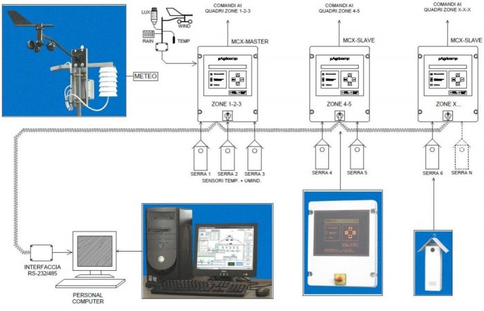 Also the MCX computers can be connected in a Master-Slave configuration in order to use only one meteo station. The number of Slaves that can be connected to a Master in theory has no limitations. This allows to control a very high number of greenhouses without problems.