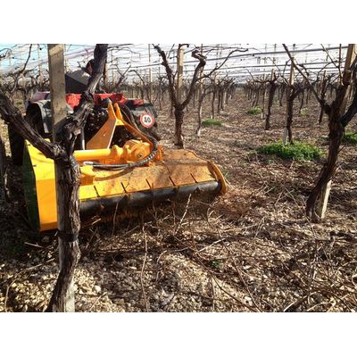 Mulcher with reversible hydraulic feeder, ideal for pruning of vineyard, dessert grapes, chestnut-trees, olive trees, almond-trees, citrus fruits, walnuts, hazels, etc. For tractors between 50 and 70 HP. Machine for demanding works, with need to deposit very thin remains in the area, avoiding possible plagues and helping to their elimination, for later processes. It has a rotor of crenellated cleavers, crossing with fixed palate.