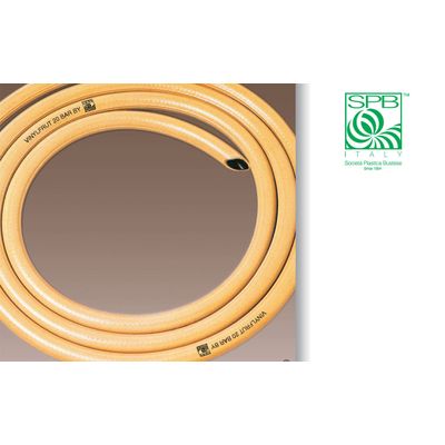 The Vinylfrut 20/30 Bar hose is a flexible PVC hose reinforced with high-tenacity polyester mesh, designed for agricultural spraying applications involving insecticides, pesticides, and other pressurized liquids. This hose is ideal for use with motor-pumps due to its robust structure and durability. It operates efficiently within a temperature range of -15°C to +50°C and is available in beige as standard, with other colors available upon request, providing versatility in various environmental conditions. Manufactured by Società Plastica Bustese, a company with 70 years of experience in the plastics industry, the hose ensures Italian quality and reliable performance.Most popular related searches