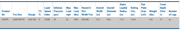 LSW (LOW SIDEWALL TECHNOLOGY) design concept will revolutionize future of tire performance. LSW`s short sidewalls will greatly reduce bounce in the field and on the road. LSW`s lower sidewall height increases side slope stability and improves handling. LSW concept will improve overall ride and handling on long transports. LSW`s shorter sidewall will increase carcass life