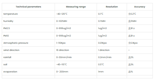 - Sensors: ambient temperature, humidity, wind speed, wind direction, air pressure, soil temperature, soil moisture sensor, soil PH, soil salinity, rainfall sensor, total radiation sensor, carbon dioxide, sunshine hours and other meteorological element sensors (according to requirements Optional).