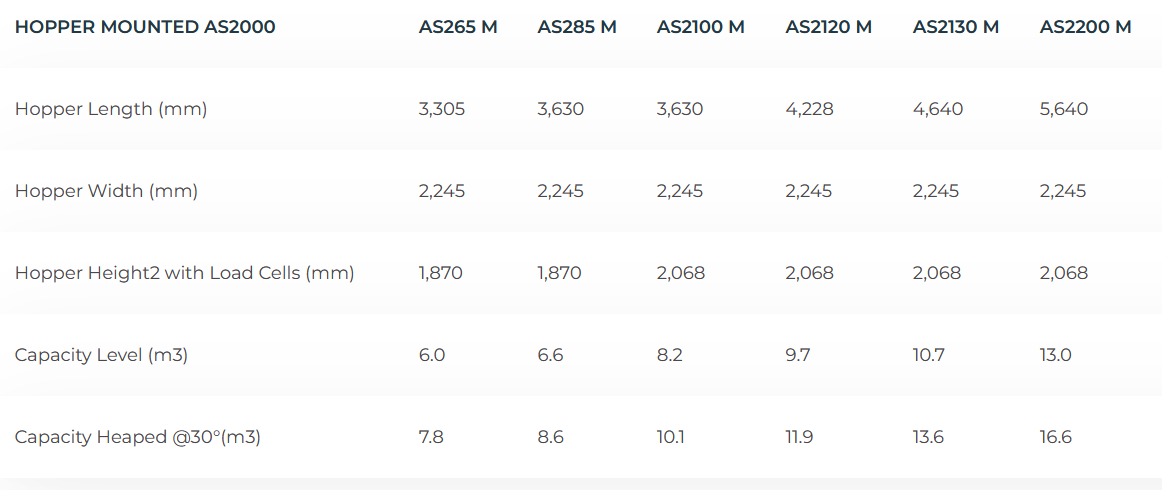 AS1000-2K Series- Hopper Mounted 6 x Model Range: 3.7m3 to 12.2m3 (Heaped Capacity @30 Degrees)