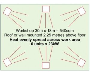 Extra throw nozzles to reach difficult corners. Door air curtains to balance heat loss with open doors. De-stratification fans to circulate rising heat in high buildings.