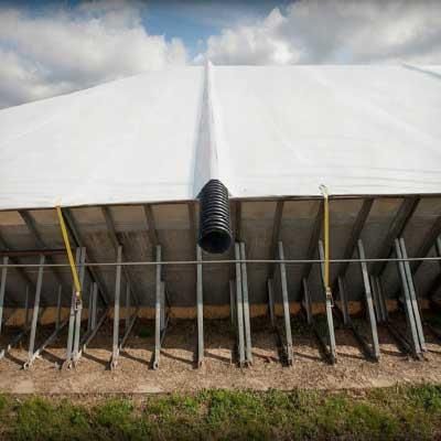 VeraFlow is built into our covers, you no longer have to place the pipe before covering. Designed for customers who use perforated PVC pipe to provide airflow throughout the pile. VeraFlow Air Intakes are manufactured with spacing increments of 24ft. This system ensures consistent spacing and balanced airflow throughout the grain pile.   Once the cover has been installed and secured, open the VeraFlow® hook and loop pocket, place the intake pipe, and close it.