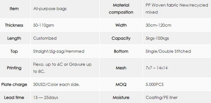 Mornpackaging offers all-purpose bags of polypropylene material in any types. Customers are allowed to order any thickness or sizes or colors of polypropylene woven bags base on their own market situation. For package of some certain products, common marks could be printed, include G.W, N.W, QTY, DATE OF PRODUCED etc. and leave blank for specific information, users can fill it in when packing.