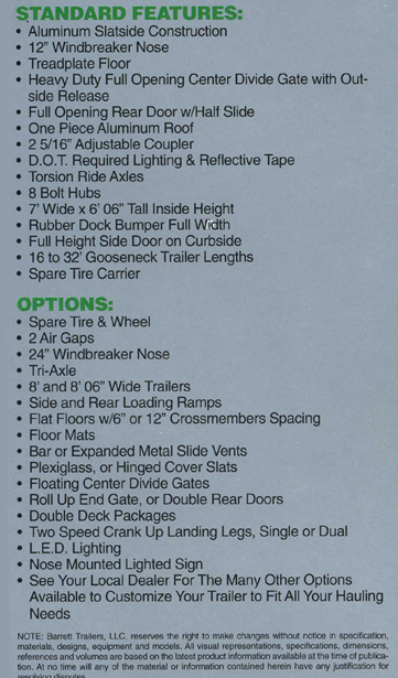Whatever the capacity you`re looking for, Barrett has a full line of gooseneck, king pin, livestock trailers that meet vour demands for quality, value, and safety.