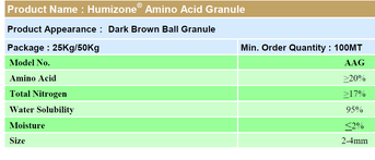 Humizone AAG (Amino Acid Granule) with high organic matter and amino acids, can replenish the protein and other nutrients. It can enhance the plant respiration, improve the oxidation and reduction of plants, and promote the metabolism of plants.
