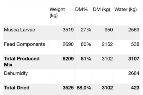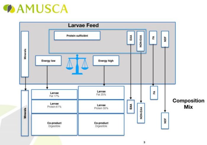 The Amusca Insect Breeding Unit produces daily a mix of 5 tonnes of larvae, crude fibre and minerals. All valuable feed components. The specifications of the mix may be adapted to your wishes by changing the insect line and the substrate composition.