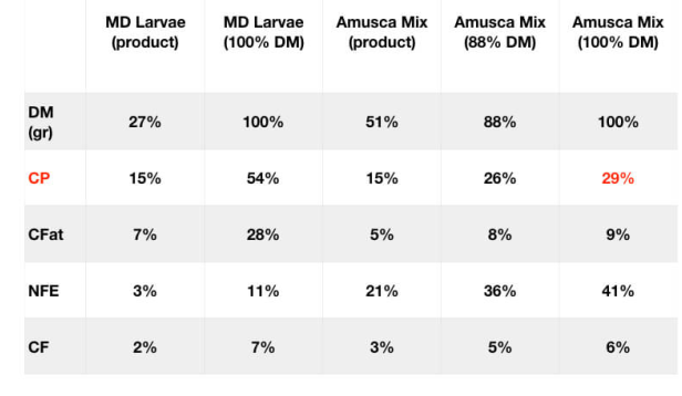 If GMP+ quality feed is chosen, the total product (larvae, crude fibre and minerals) can be applied in animal feed. The composition of the Amusca Mix depends on the feed given to the larvae.