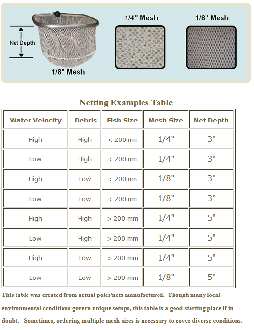 The method for selecting your pole and net parameters should be a combination of environment needs and comfort. The example below is a very common setup for clean, slow-moving streams. The short pole length and small mesh allow for high dexterity in pursuit of smaller fish. Faster or larger streams would most likely require longer poles and an increased hoop size.