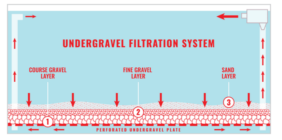 First lay coarse particles onto your undergravel filter tray for protection, then layer finer gravels to sand to have the best of both worlds. See diagram below.