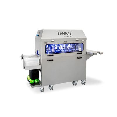 The TENRIT SOLO A / M-FWS asparagus peeling machine is the mobile version of the TENRIT SOLO A and is very popular with both market suppliers and supermarket chains. "Mobile" in this context means that only one 230V power supply and a water supply is needed for its operation. To allow autonomous operation at a market or in a supermarket, the machine is equipped in addition to the standard equipment with a low-noise compressor and an integrated water pump with automatic pump shut-off.