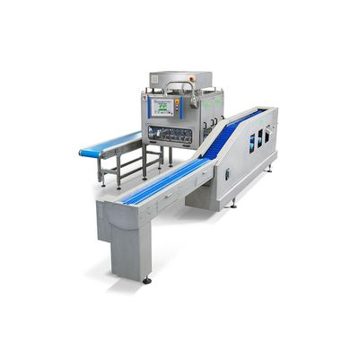 The asparagus is placed on a conveyor and automatically conveyed further into the trays of the feed belt. From the feed belt, the asparagus is deposited in V-belts and further conveyed into the respective peeling module. An infeed gripper ensures a smooth transfer process.
