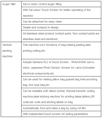 This packing unit consists of one vertical packing machine for bagging ,one set auger filler for weighing , one vertical bucket elevator for feeding , one conveyor for taking off the finished bags .It integrates functions of automatic bag-making, weighing, filling, sealing, printing, punching, cutting and sealing into one. The advanced design has guaranteed this machine suits for different kinds of powder,like coffee powder,flour, milk powder,seasoning powder,etc. Its adjustment , operation and maintenance are very convenient.