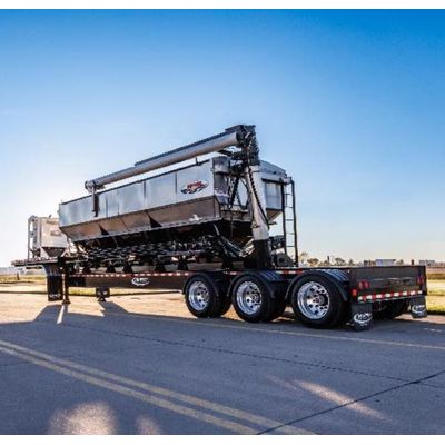 The Simonsen BFT-STRTA top auger trailer mounted tender is the workhorse of DRY TENDERS. Shown is the 830 cubic feet 304 Stainless Steel with 50 degree slope 24` tender on a triple axle trailer. Standard on this series is the 10x13x10 delivery auger system, large trap openings, and steep slopes combine to offer unloading speeds of up to #4000 per minute.