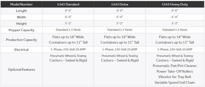 - Production Capacity: Flats up to 18 in. wide, Containers up to 11 in. tall