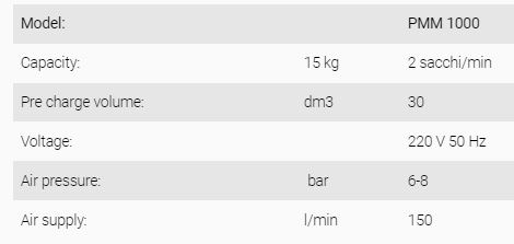 Hopper for product receiving with connection collector to the machine of 0,75 m3. Fitting hopper of 65 dm3 connected to the vibrating dosing system. Vibrating system with loading cells, programmable with PLC, bag lifted from pneumatic cyclinder that after the filling is released.