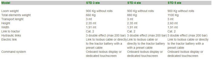 Standard equipment:Computer-based system: with or without Isobus. Hydraulic loom opening and closing. Hydraulic system to load drip line rolls in a easier way. Possibility to place drip lines on or into the ground in a continuous or alternating way. Plowshares to place drip lines into the ground.