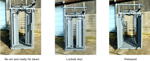 The automatic head gate works well with all types of cattle but is particularly well suited to farms where cattle are relatively feisty, or for finishing units where individual beasts only pass through the Squeeze Crush a few times. Both sides are spring loaded, removing the need to adjust the width of the head gate for different neck sizes. Two levers give the operator the choice of releasing the beast forwards through the head gate or backwards and out of the side exit. Optional extras include: Head tables in two sizes and a head scoop for rapid restraint of an animal’s head. An ingenious system allows quick adjustment to enable a large bull or horned beast to enter and lock the fully opened head gate.