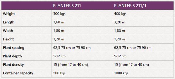 Automatic planters for potatoes S-211 and S-211/1 merge advantages of complicated western machines and simplicity performance and service. They’re characterized by very high productivity and reliability. They provide high precision of planting. They’ve got adjustment for plant spacing, depth and density of planting ability to change decreasing inserts and increasing ones.