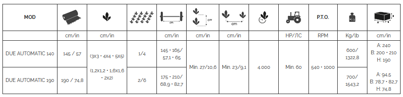 Due Automatic is the automatic transplanting-mulching machine for square soil blocks 3x3e/o 4×4 e/o 5×5. It consists on an automatic feeding system equipped with a belt which supplies with plants the cups of a vertical transplanting element. The working depth is kept constant by a roller, which levels the ground and make the transplanting elements move. The machine is equipped with a pneumatic and hydraulic independent system and with PTO. It is available with or without the mulch system layer (plastic, biodegradable film or cellulose). Due Automatic can be towed by the tractor, and the Due Auto-Matic is the self –propelled machine with an hydrostatic drive version equipped with automatic pilot.