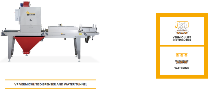 Automatic tray destacker, tray filler with adjustable speed and propeller style compactor, high precision seeder, 3 kW vacuum pump, Vermiculite distributor with water tunnel, end line tray stacker.