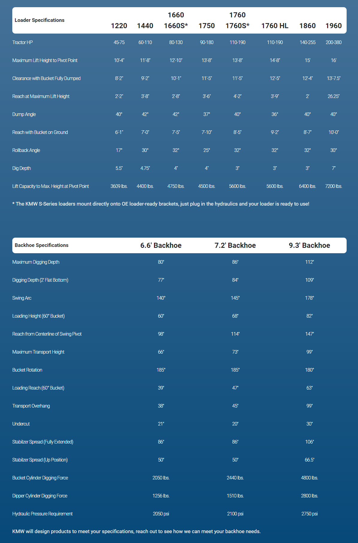 KMW knows you need reliable equipment. Our innovative backhoes are designed to be powerful and durable. Built to deliver the rugged equipment you deserve, each KMW backhoe features: an open, modern operator area for visibility and precision, high-quality valves with tight tolerances combined with in, circuit port relief valves to protect your investment, optional mechanical thumb kits, single or dual cushion swing cylinders, depending on backhoe size.