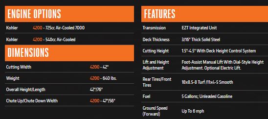 Dual Integrated Drive Systems provide reliable, self-contained power and performance. Features strong 2˝ x 2˝ all steel rail frame for its backbone with 3/8˝ steel front forks. The solid steel, all-welded deck, formed from tough 7-gauge steel with reinforced edges, features a baffling system to maximize airflow for greater grass lift and a cleaner cut. The frame rides on a lower center of gravity for better traction.