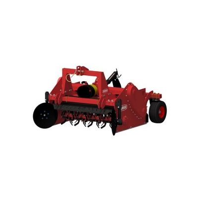 Universal 3 point linkage Cat. 2. Single speed gearbox 540 rpm PTO. Front tilling rotor Ø370 mm. Tilling rotor transmission chain in oil bath. Removable flanged rotors. Automatic chain tensioner on spring. Rear crumbling rotor Ø360 mm with high resistance and wearing steel spikes. Rear rotor transmission chain in oil bath. Front dual metal face seals in oil bath on rotors 4x blades per flange, length 245 mm. Pair of front adjustable lateral discs adjustable in width and height Ø 460 mm. Rear adjustable hood. Working depth adjustable by crank handles. Pair of wearing round rod on side pannels. Cardan shaft with shear bolt torque limiter SB type (1”3/8 Z=6 tractor side yoke).