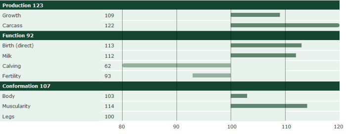 T index 102. FEF index 100. U figur 111. Daily growth 1793.00. Feed efficiency 5.32. LD area cm2 89.60.