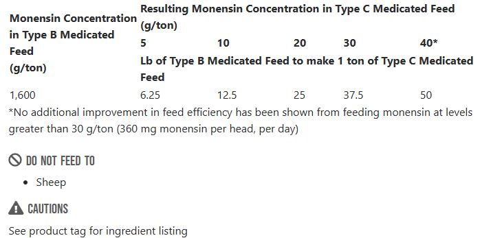 Thoroughly mix monensin Type B medicated feed with non-medicated feed to manufacture another concentration of Type B medicated feed or a Type C medicated feed. The Type C medicated feed will have a final concentration of 5 to 40 g/ton monensin for improved feed efficiency or 10 to 40 g/ton monensin for the prevention and control of coccidiosis. No additional improvement in feed efficiency has been shown from feeding monensin at levels greater than 30 g/ton (360 mg monensin per head per day). The following table gives examples of how some Type C medicated feed concentrations can be prepared: