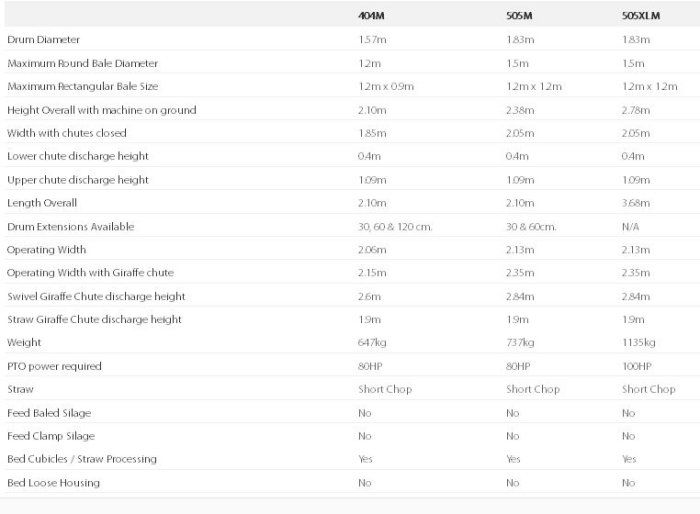 The 404M/505M/505XLM range is suitable for dry material only, and will not cut silage as it will block the mill sieve.