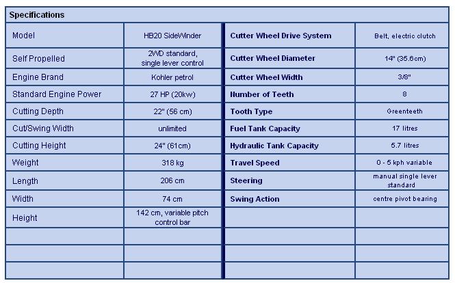 The compact Model HB20 SideWinder is powerful enough to tackle the difficult to reach stumps fast.It offers the popular pivot-action base allowing the user to keep the wheel base stationary while using a smooth gliding motion back and forth to easily grind stumps. Bandit`s HB20SP is fitted with a single lever to control all forward and backwards movement of the machine - far easier to manoeuvre than other machines with a dual lever system. Fitted with a Kohler Command 27hp petrol engine, Bandit`s HB20 SideWinder is built tough like all of Bandit`s machines. With excellent spare parts and back-up support, the Sidewinder could be just what you are looking for. Call us today and arrange a demonstration - you will not be disappointed.